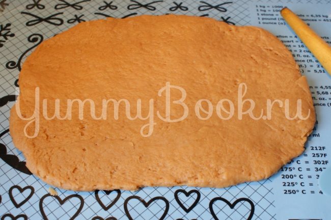Рабочую поверхность припудрить мукой и раскатать пласт толщиной 0,5-1 см. Чем тоньше раскатано тесто, тем хрустящее будет печенье.