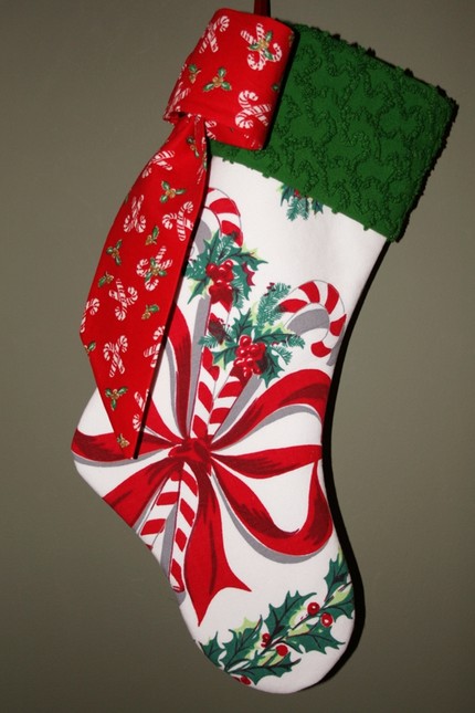 4. Рождественские носки можно сшить из традиционной красной ткани, и сделать окантовку из широкой зеленой ленты. Или сшить из рождественской ткани (на это дело можно пустить новогоднее полотенце – они часто бывают с красивыми праздничными узорами). Но главное – это потом этот самосшитый носок украсить, как следует! Можно использовать для отделки верхнего края уютный искусственный мех или воздушный тюль.
